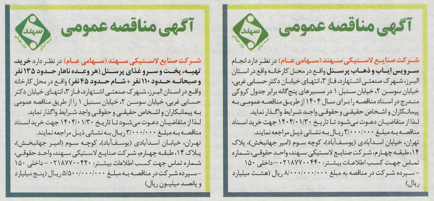 شرکت صنایع لاستیکی سهند (سهامی عام) در نظر دارد « انجام سرویس ایاب و ذهاب پرسنل »  واقع در محل کارخانه واقع در استان البرز، شهرک صنعتی اشتهارد، فاز۳، انتهای خیابان دکتر حسابی غربی، خیابان سوسن ۲، خیابان سنبل ۱  در مسیرهای پنج گانه برابر جدول و کروکی مندرج در اسناد مناقصه را برای سال ۱۴۰۴ از طریق مناقصه عمومی به پیمانکاران و اشخاص حقیقی و حقوقی واجد شرایط واگذار نماید.