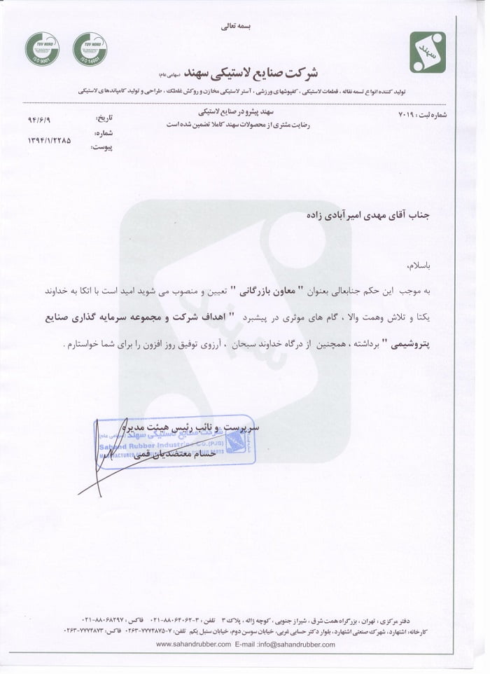 در مورخ ۹ شهریور ۱۳۹۴ جناب آقای مهدی امیرآبادی زاده توسط سرپرست شرکت صنایع لاستیکی سهند جناب آقای معتضدیان قمی به عنوان معاونت بازرگانی این شرکت منصوب گردیدند .