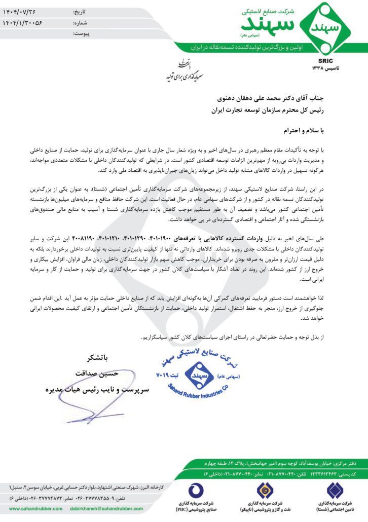 به گزارش روابطعمومی شرکت صنایع لاستیکی سهند، حسین صداقت، سرپرست و نایبرئیس هیئتمدیره این شرکت، در نامهای رسمی خطاب به محمدعلی دهقان دهنوی، رئیس کل سازمان توسعه تجارت ایران، بر ضرورت بازنگری در سیاستهای تجاری و ارزی کشور به منظور مقابله با واردات بیرویه کالاهای بیکیفیت و مشابه تولید داخل تاکید کرد.